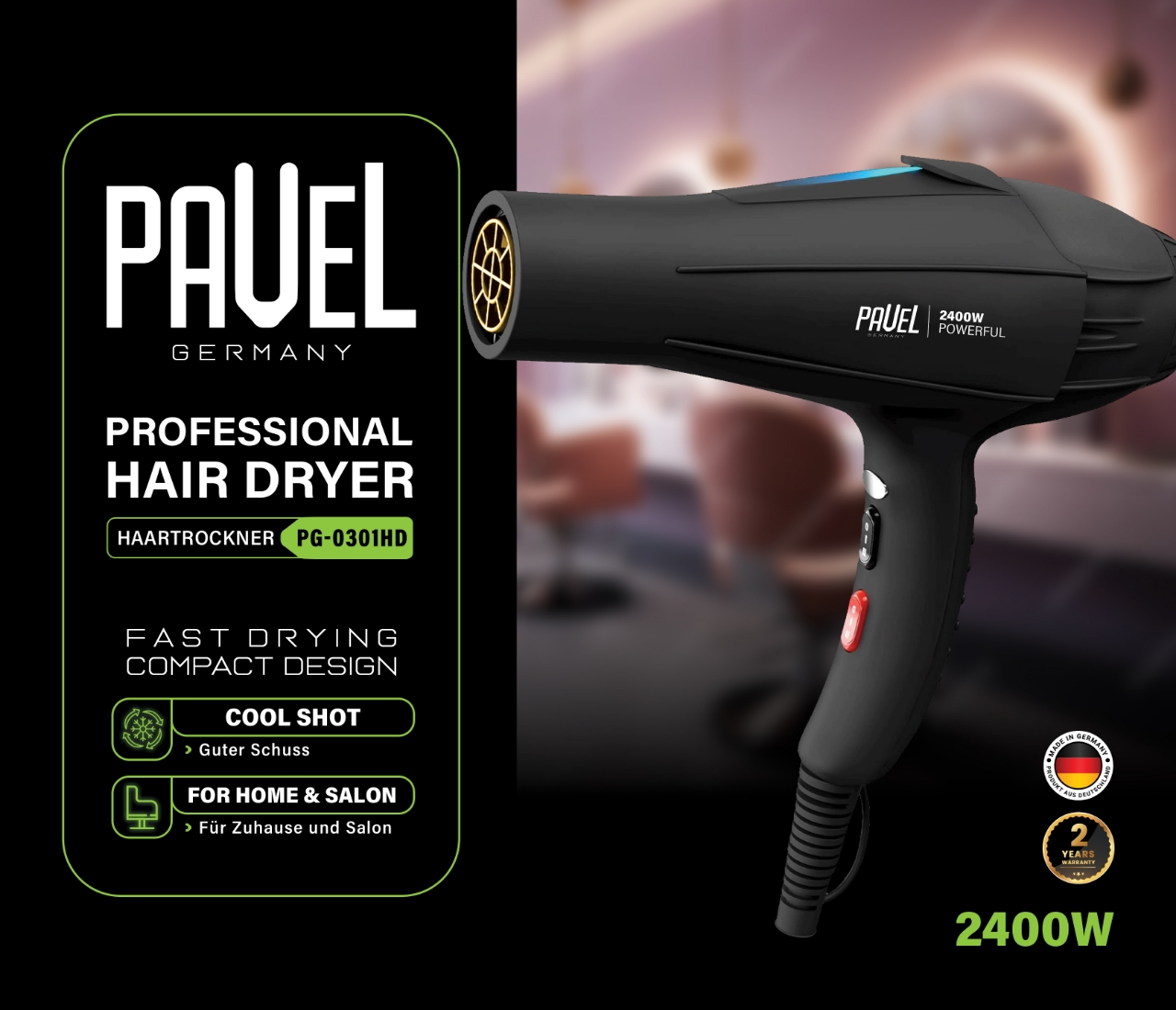 سشوار حرفه ای پاول آلمان جهت مصارف سالن و خانه پر قدرت ۲۴۰۰وات توربو تا ۳۰۰۰ موتور تمام مس ACموتور موتور تمام مس توری تیتانیوم دارای دیسپانسر سیم گردان نور ین زدا