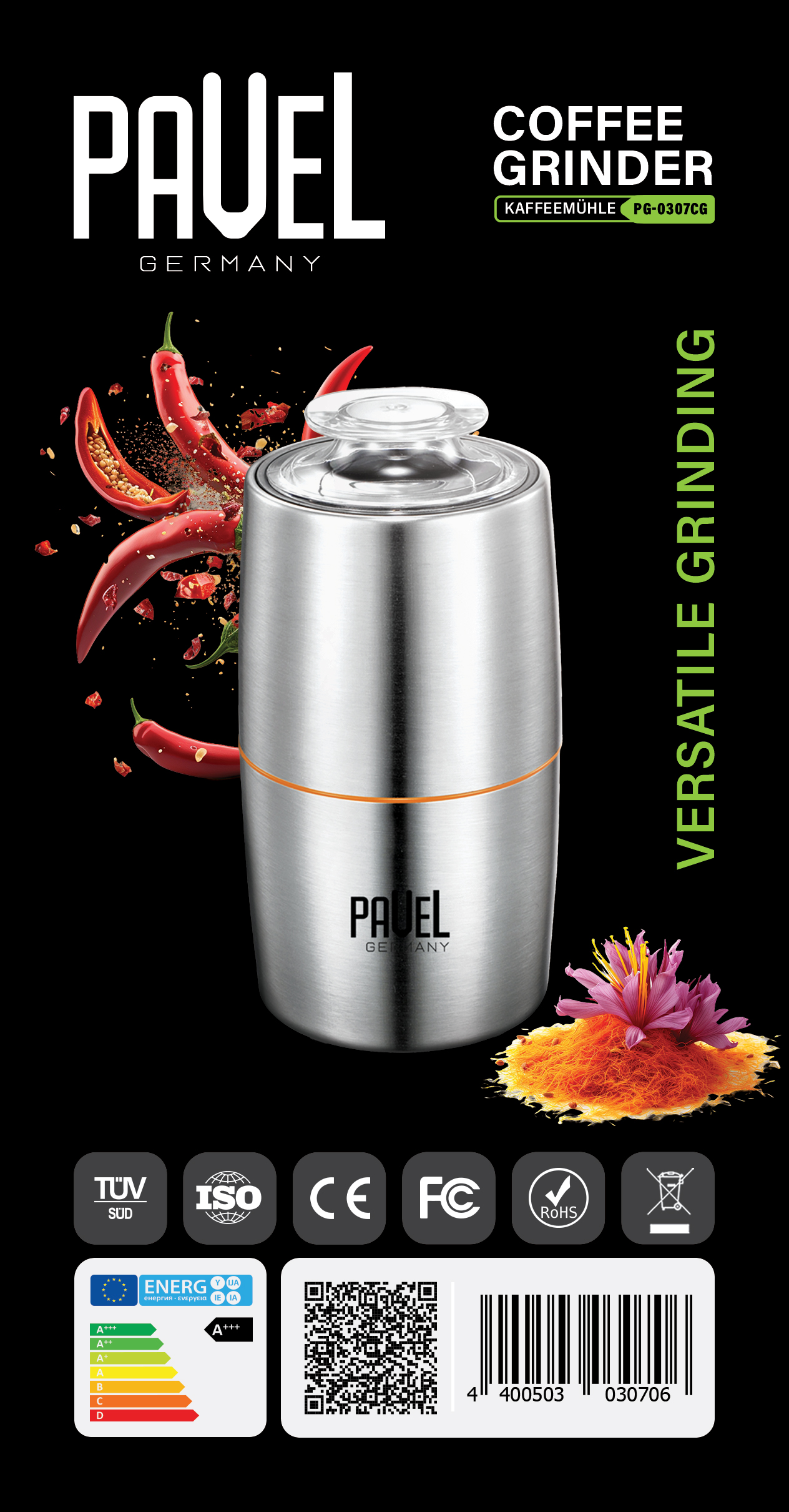آسیاب قهوه پاول آلمان موتور تمام مس پر قدرت بدنه استیل قابل شستشو جهت آسیاب قهوه زعفران ادویه دارچین طراحی زیبا